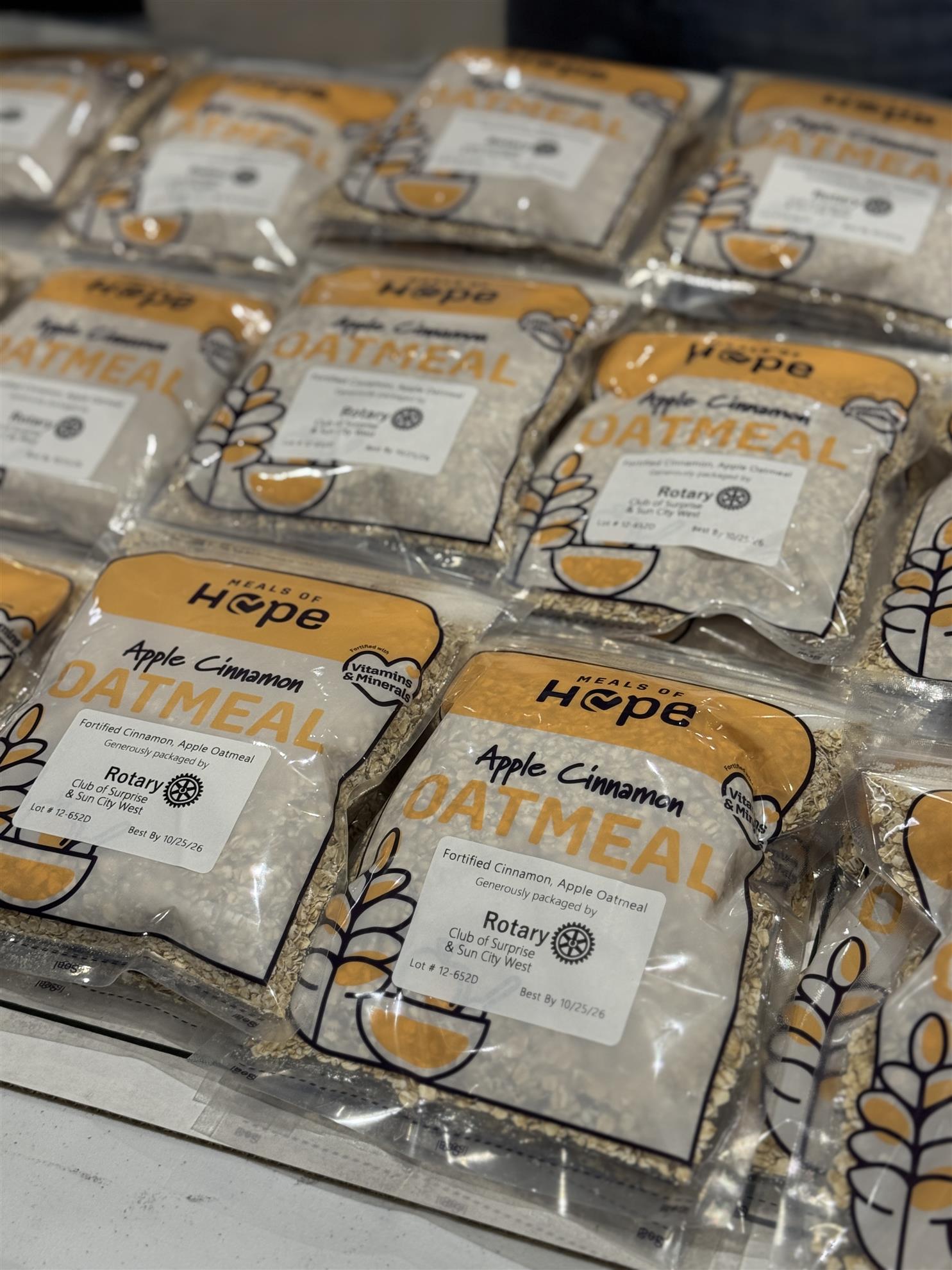 We started this effort after Phil and Sally saw an advertisement in our Rotarian Magazine in February 25.Turns out this service project is similar to the Feed my Starving Children event we had just completed in February at Lord of Life Lutheran Church in Sun City West, but with the food staying locally. We initially met with Debbie Sullivan on March 14 at Phil’s house and discussed the financial ramifications, what volunteer efforts would be required (how many, how the work would go) and where the food would go. With Phil’s and Sally’s leadership we took this to the Board. We then met Jesse Ramirez at the Valley View Community Food Bank to solidify the logistics of delivering the packaged food on March 25. The Club Board agreed to pursue this project at our April Board meeting and went forward with pursuing a City of Surprise COP grant (not successful) and a District 5495 grant (which was successful). The Charitable Fund of Surprise & Sun City West Rotary Club agreed to provide the initial funding for the project ($8750) and we were off. Jim, Sally, Glenn and others kept chasing funds and worked with the City to put into its Day of Service.
